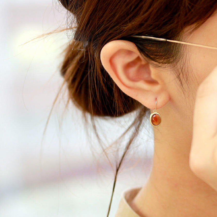 )とろみのあるシックな赤に、ひとめぼれ ヘソナイト(オレンジガーネット)×ゴールドピアス・シルフ ぷるぷるに艶めくカボションカットの大粒ヘソナイトを使用して、存在感たっぷりの一粒ピアスをおつくりしました。